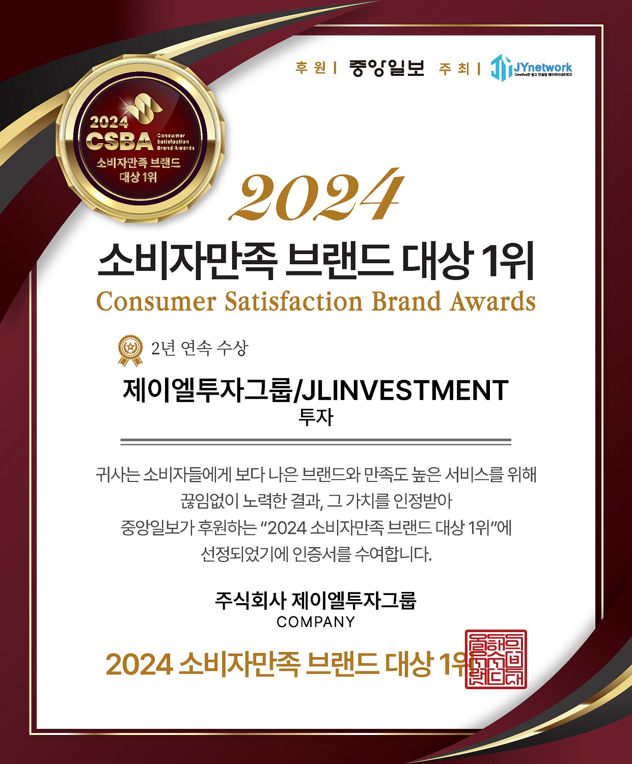 2024 소비자만족 브랜드 대상 1위 제이엘투자그룹 / JLINVESTMENT 투자부문 2년 연속 수상 귀사는 소비자들에게 보다 나은 브랜드와 만족도 높은 서비스를 위해 끊임없이 노력한 결과, 그 가치를 인정받아 중앙일보가 후원하는 "2024 소비자만족 브랜드 대상 1위"에 선정되었기에 인증서를 수여합니다. ![]()