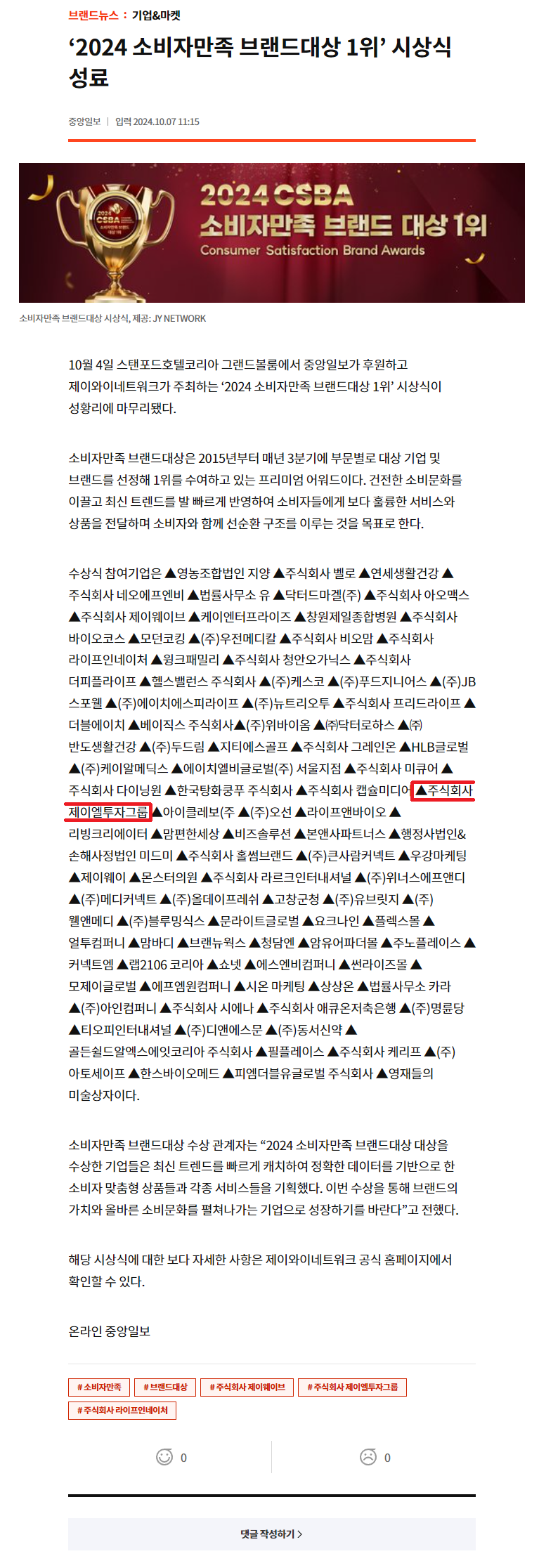 | 제목 | 제이엘투자그룹, 중앙일보가 후원하는 ′2024년 소비자만족 브랜드 대상 1위′ 투자 부문 2년 연속 수상 |