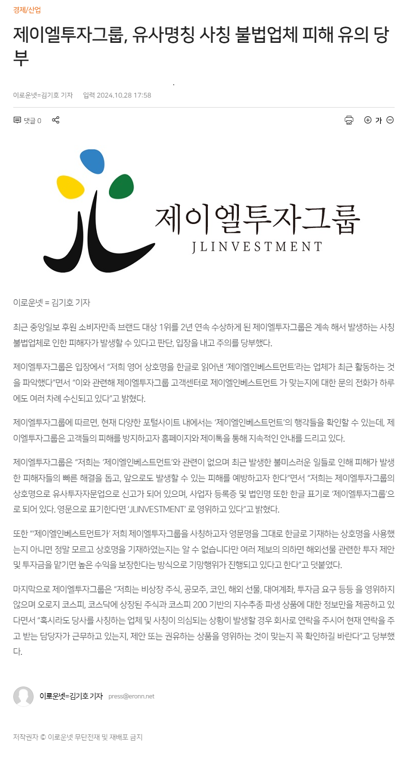 또한 “‘제이엘인베스트먼트가’ 저희 제이엘투자그룹을 사칭하고자 영문명을 그대로 한글로 기재하는 상호명을 사용했는지 아니면 정말 모르고 상호명을 기재하였는지는 알 수 없습니다만 여러 제보의 의하면 해외선물 관련한 투자 제안 및 투자금을 맡기면 높은 수익을 보장한다는 방식으로 기망행위가 진행되고 있다고 한다”고 덧붙였다.