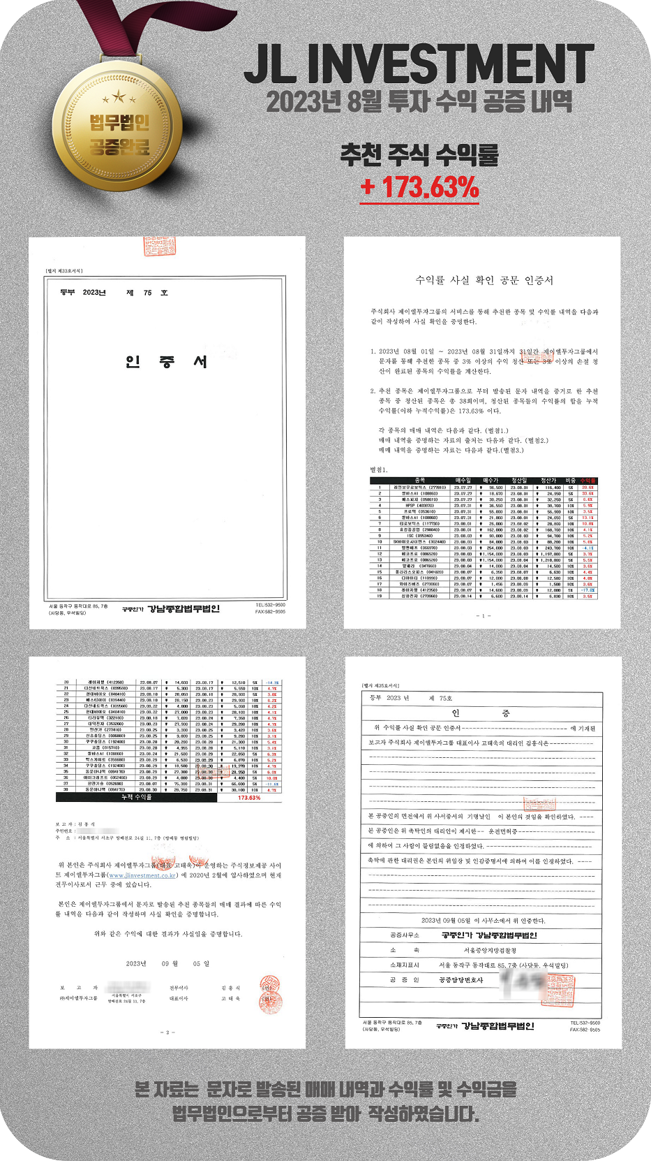 제이엘투자그룹, 2023년 08월 VIP종합반 투자 수익 공증 내역